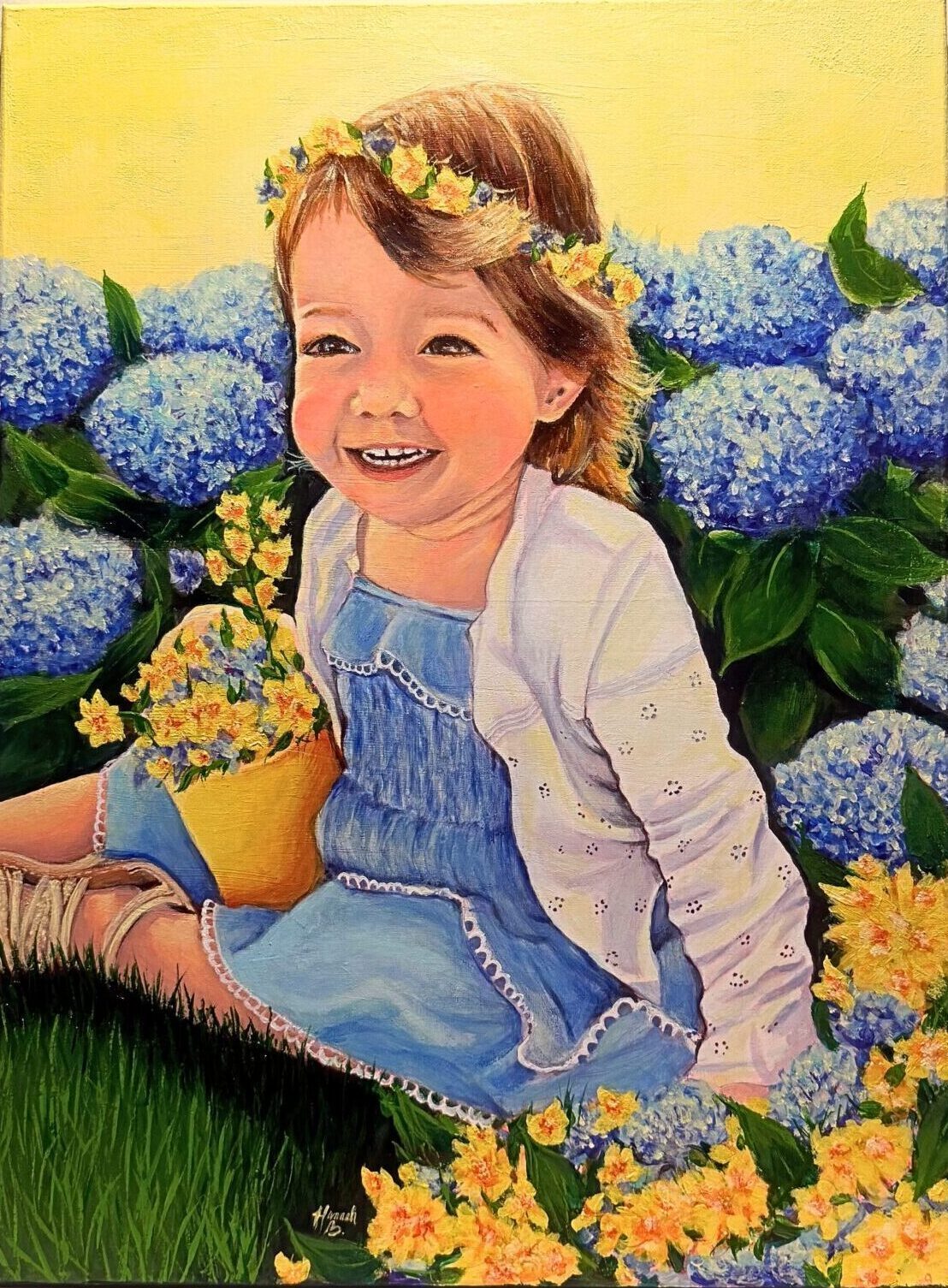 This painting captures the child’s natural ability to bring joy into people’s lives. with adding in a playful effect of flowers and bright, yellow lighting, the child’s smile is brought to a light it deserves.